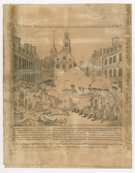 This copy of Paul Revere’s original 1770 engraving depicting the Boston Massacre was made in 1832 and was created using Revere’s original plate. From the Dorchester Antiquarian and Historical Society Collection, 1635-1874, R. Stanton Avery Special Collections, courtesy image.