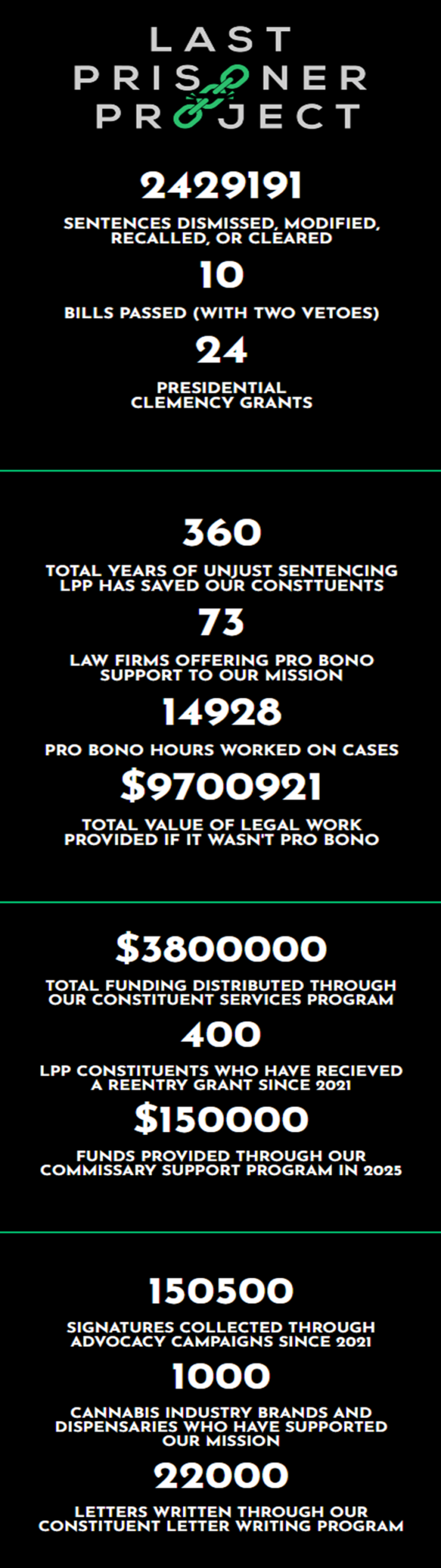 The Last Prisoner Project (LPP) was founded to close that gap. A national nonprofit dedicated to cannabis criminal justice reform, LPP focuses on legal advocacy, sentence review support, clemency and release efforts, policy reform, and reentry services for people impacted by cannabis prohibition. Beyond advocacy, the organization provides direct constituent services, helping individuals navigate complex legal systems, prepare for reentry, and rebuild stability for themselves and their families.