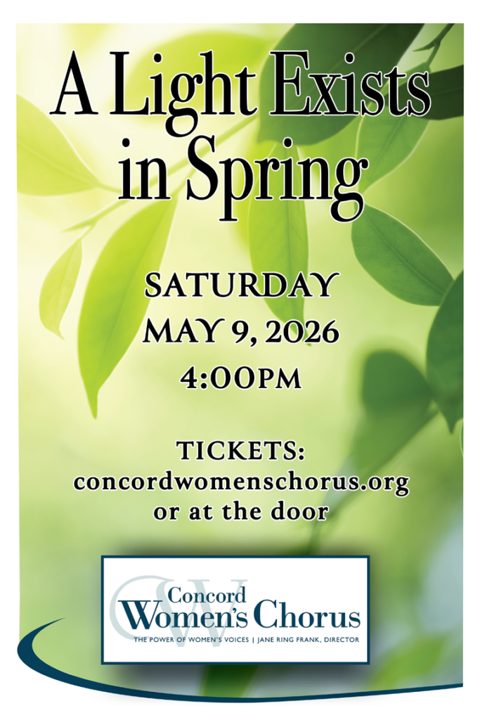 McGRATHPR.com – Concord Women’s Chorus (CWC), fostering the power of women’s voices in song, presents its spring concert “A Light Exists in Spring,” on Saturday, May 9, 4 pm, Trinity Episcopal Church, 81 Elm St., Concord. The performance is conducted by CWC Artistic Director Jane Ring Frank, accompanied by Simon Andrews, piano, together with guest instrumentalists Jennifer Slowik, oboe, Sandi-Jo Malmon, cello, and Beth Welty, violin.