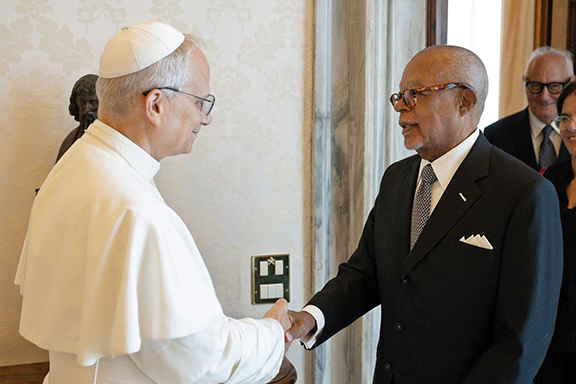 Pope Leo XIV greets Dr. Henry Louis Gates Jr., during a private audience at the Vatican, image by Vatican Media
