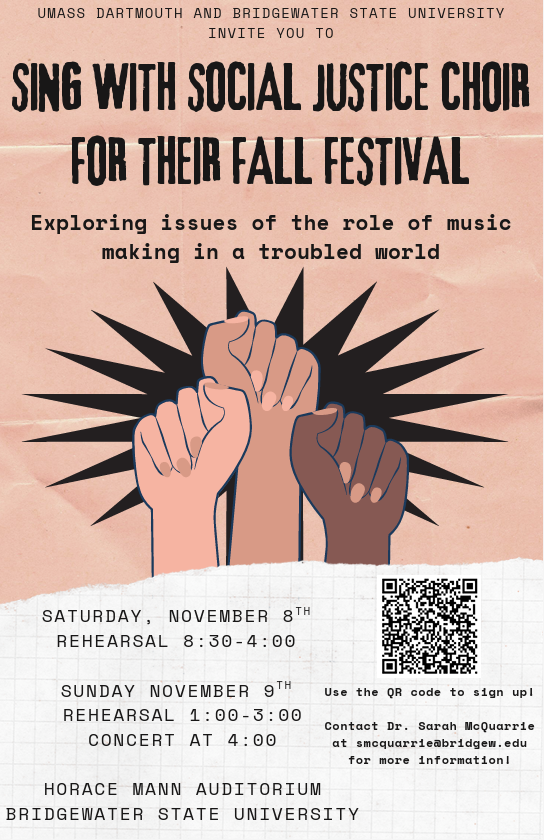 McGRATHPR.com – The Social Justice Choir of Southeastern Massachusetts (SJCSM) invites singers and audiences from across the Southeastern Massachusetts region to listen in or sing at its “Fall Festival,” a weekend-long celebration of music, community, and service, with singer rehearsals on Saturday, November 8, 8:30 am to 4 pm, and Sunday, November 9, 1 to 3 pm, culminating in a free public concert on Sunday, November 9, at 4 pm, at Bridgewater State University’s Horace Mann Auditorium, 131 Summer St., Bridgewater.  The festival welcomes both experienced and novice singers to join the combined ensembles of Bridgewater State University (BSU), the University of Massachusetts Dartmouth (UMD), and community participants.