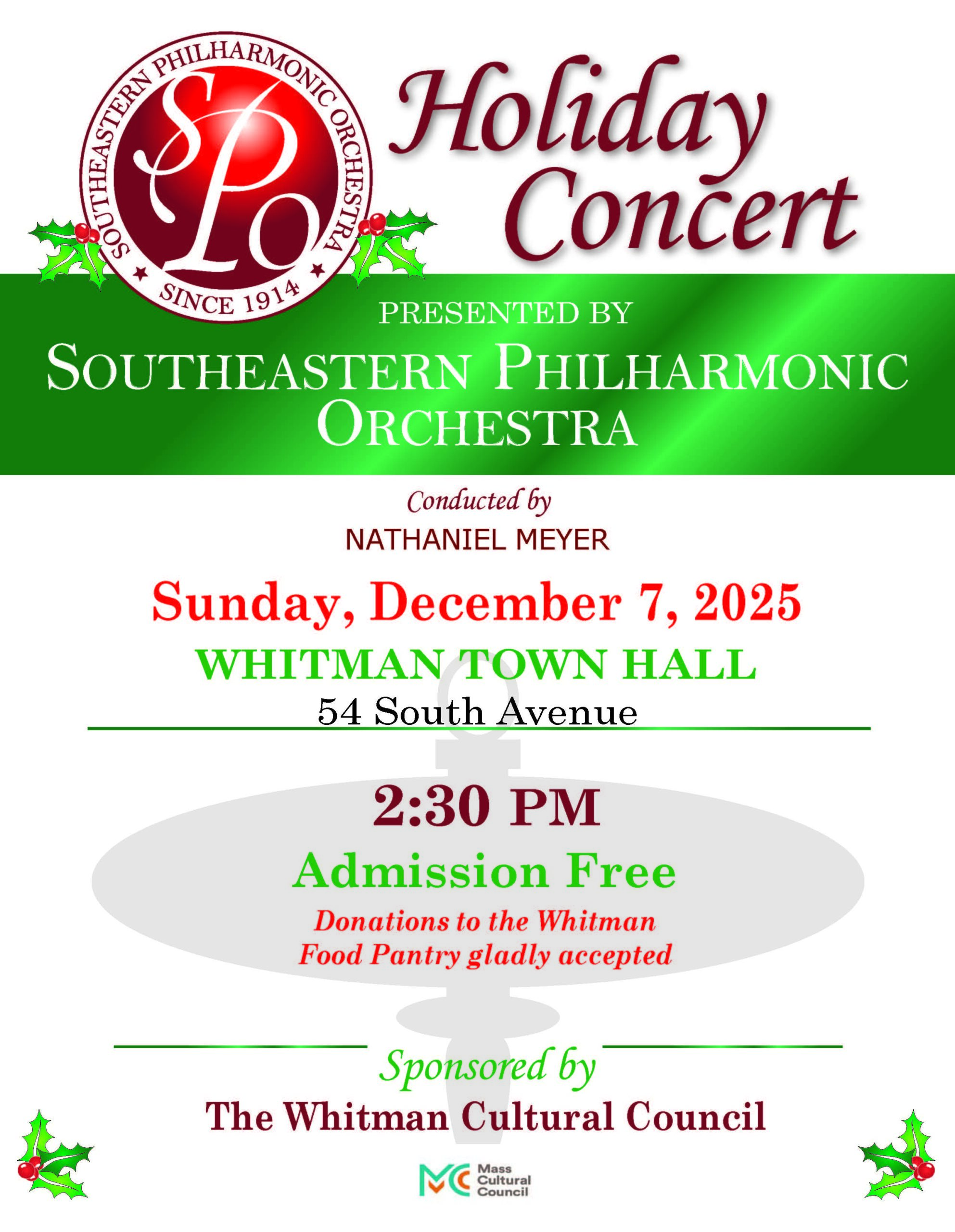 PATRIOTLEDGER.com – The Southeastern Philharmonic Orchestra will present a free holiday concert at 2:30 p.m. Dec. 7 at Whitman Town Hall, 54 South Ave. The event is open to the public, and attendees are encouraged to bring donations for the Whitman Food Pantry, according to a community announcement.