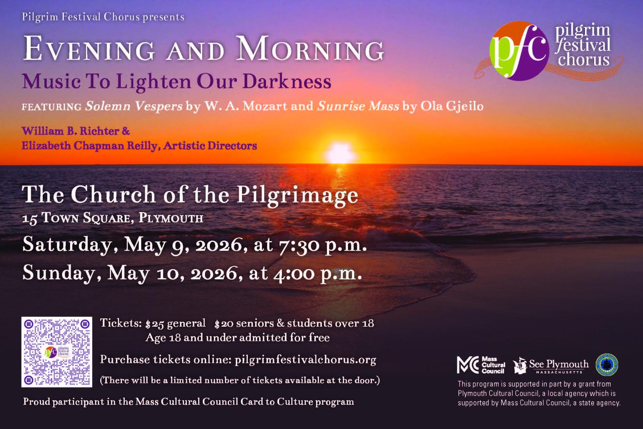 Pilgrim Festival Chorus (PFC) is a 90-member premier, welcoming community choral ensemble, comprised of experienced vocalists from 20 South Shore communities. Marking its 26th season, the chorus is led by artistic directors William B. Richter and Elizabeth Chapman Reilly. Pilgrim Festival Chorus is dedicated to presenting diverse choral works that educate, enrich, and engage both its members and its audiences.