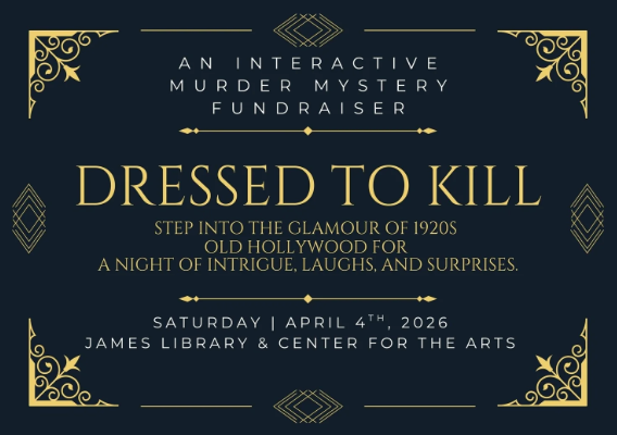 Step into the glamour of 1920s old Hollywood for a night of intrigue, laughs, and surprises. Dress in your Old Hollywood best, solve the mystery, and bid on auction items to die for—all in support of the James Library & Center for the Arts.