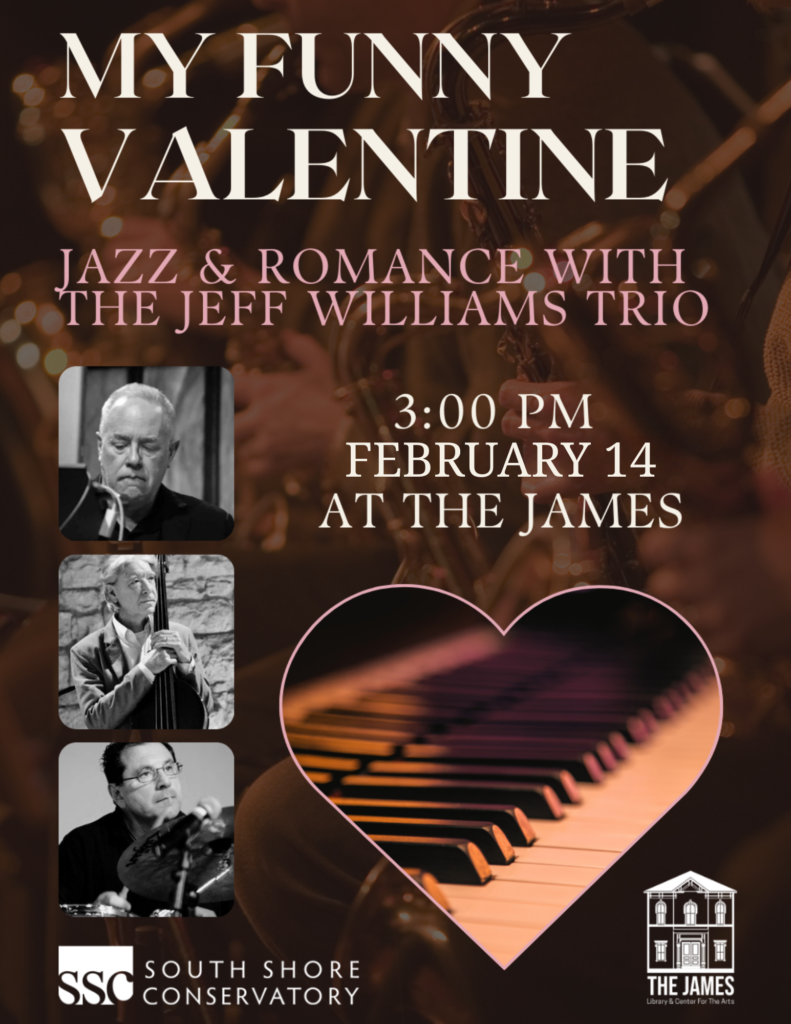 Celebrate Valentine’s Day with an afternoon of timeless jazz and heartfelt romance. South Shore Conservatory’s award-winning pianist Jeff Williams is joined by Chris Rathbun, bass and Ed Sorrentino, drums for an intimate performance featuring beloved love songs and jazz standards that have defined romance for generations.