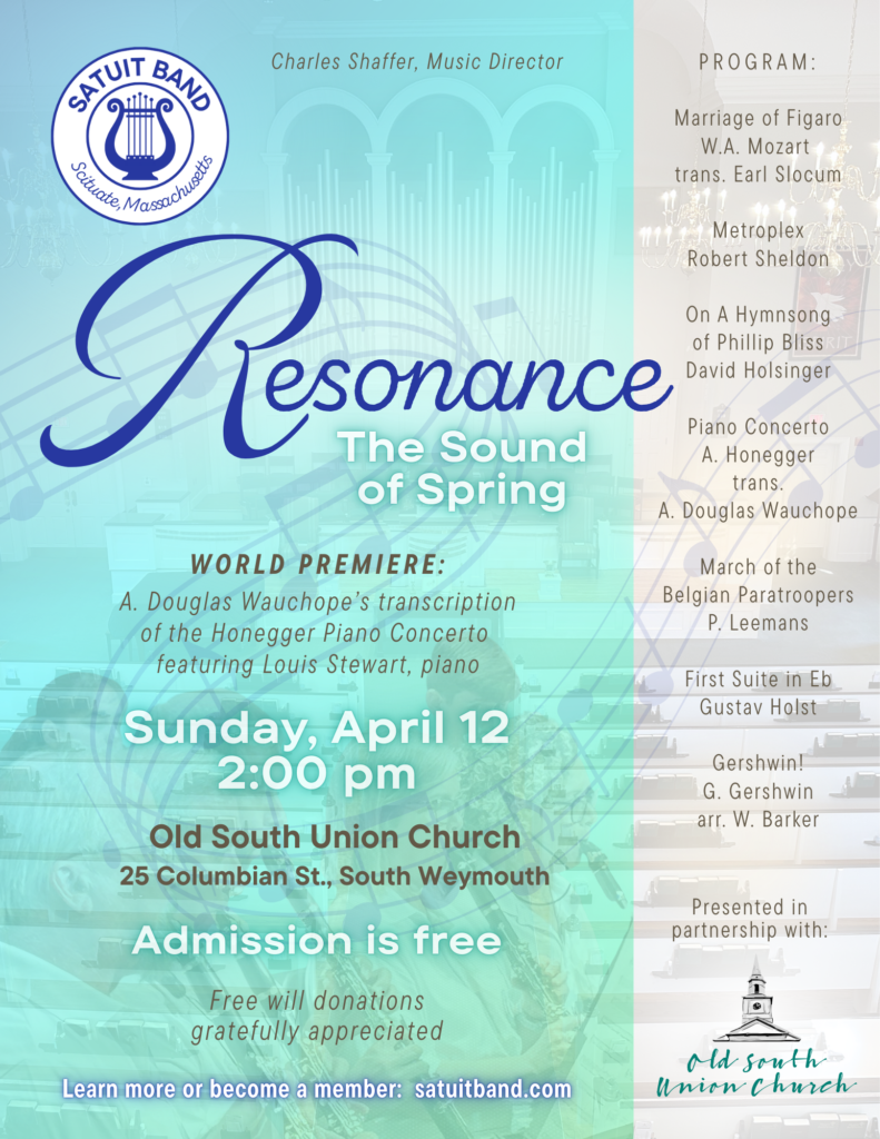 Stewart’s performance in “Resonance” marks an exciting collaboration between the Satuit Band and one of New England’s most respected piano artists.  The concert program includes diverse symphonic selections ranging from Mozart to Gershwin, showcasing the ensemble’s versatility and commitment to diverse repertoire: