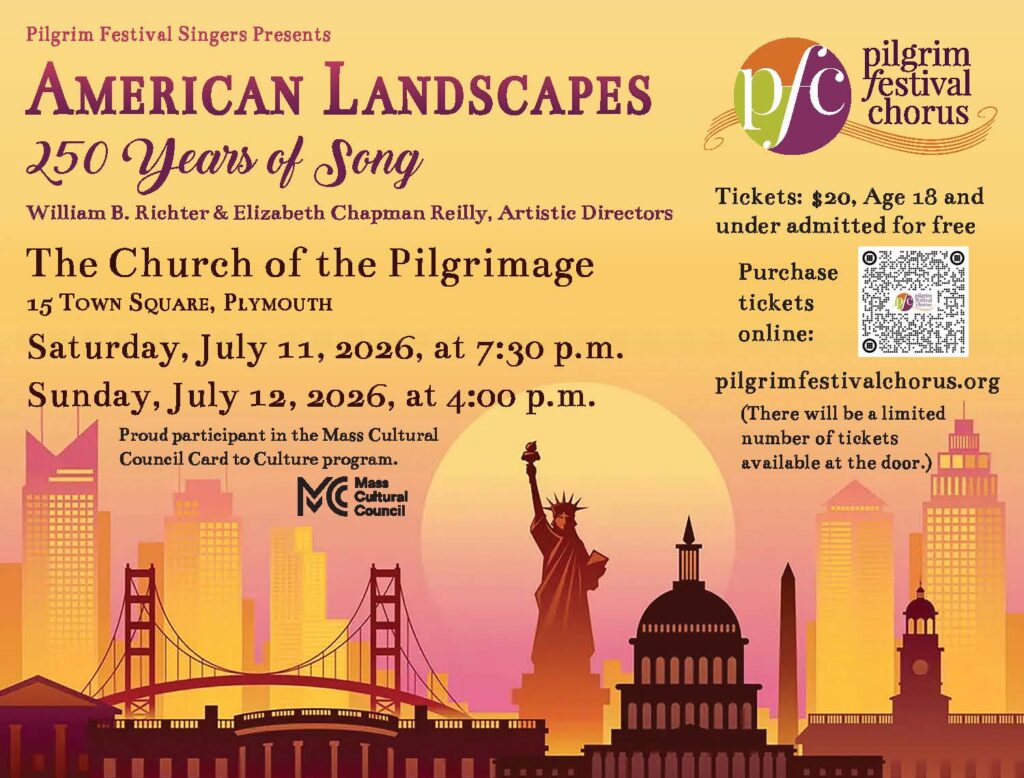 Pilgrim Festival Chorus joins the rest of the country in celebrating America 250 this year. Two performances of “American Landscapes: 250 Years of Song” at the 1840 Church of the Pilgrimage in downtown Plymouth include American music that charts our beginnings as a nation and will include songs that highlight our subsequent history: folk tunes, spirituals, ragtime, jazz, and Broadway. The concerts also incorporate arrangements of favorite patriotic American songs, with the opportunity for an audience singalong.